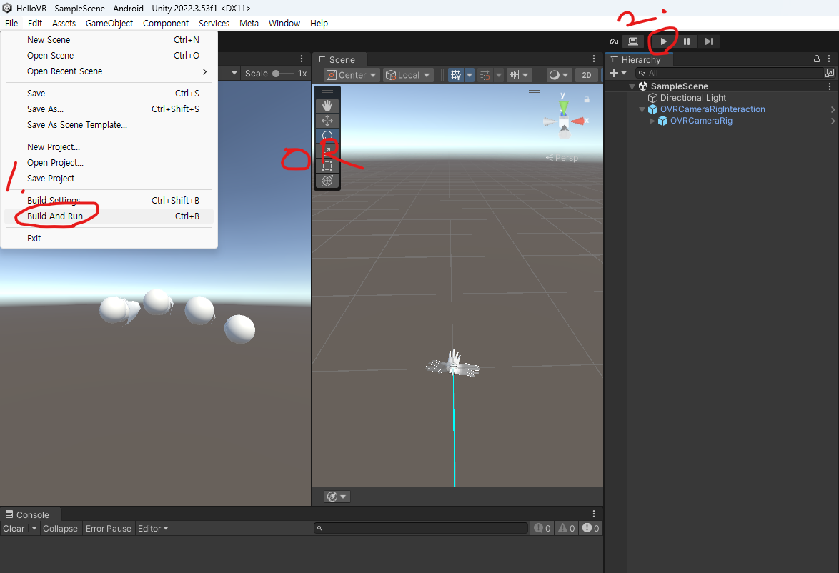 이전에 만들었던 HelloVR 프로젝트를 열어줍니다. 그리고 Hierarchy창에서 Directional Light를 제외한 모든 오브젝트들을 제거해줍니다.(선택 후 Delete키 누르면 됨)