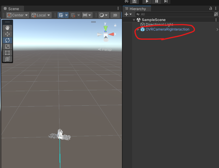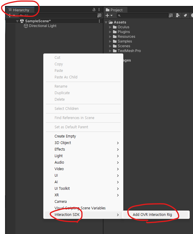 다음으로, Hierarchy 에서 마우스 오른쪽 버튼을 클릭하고 Interaction SDK > Add OVR Interaction Rig를 선택합니다. 그러면 Rig가 자동으로 추가됩니다.